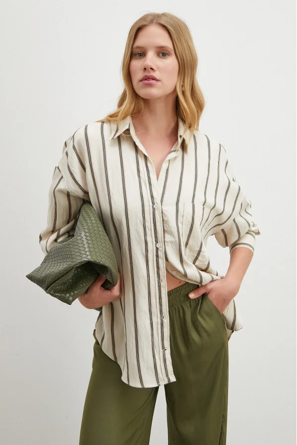 Çizgili Viskon Gömlek Haki