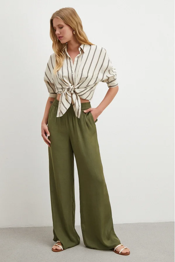 Çizgili Viskon Gömlek Haki